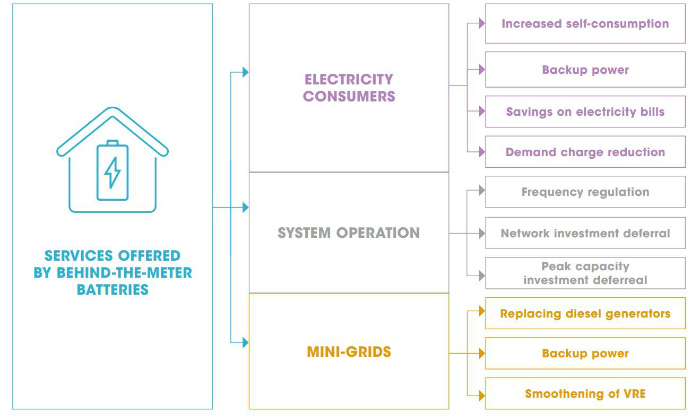 Bateriile din spatele contorului (BTM) sunt conectate în spatele contorului de utilități al clienților comerciali, industriali sau rezidențiali, vizând în primul rând economisirea facturilor de energie electrică. Instalațiile de baterii BTM la nivel global sunt în creștere.Această creștere a fost determinată de scăderea costurilor tehnologiei de stocare a bateriilor, datorită pieței în creștere a consumatorilor și dezvoltării vehiculelor electrice (EV) și a EV-urilor hibride plug-in (PHEV), împreună cu implementarea producției distribuite de energie regenerabilă și a dezvoltarea rețelelor inteligente. De exemplu, în Germania, 40% din aplicațiile solare fotovoltaice recente de pe acoperiș au fost instalate cu baterii BTM. Australia își propune să ajungă la un milion de instalații de baterii BTM până în 2025, cu 21 000 de sisteme instalate în țară în 2017.
